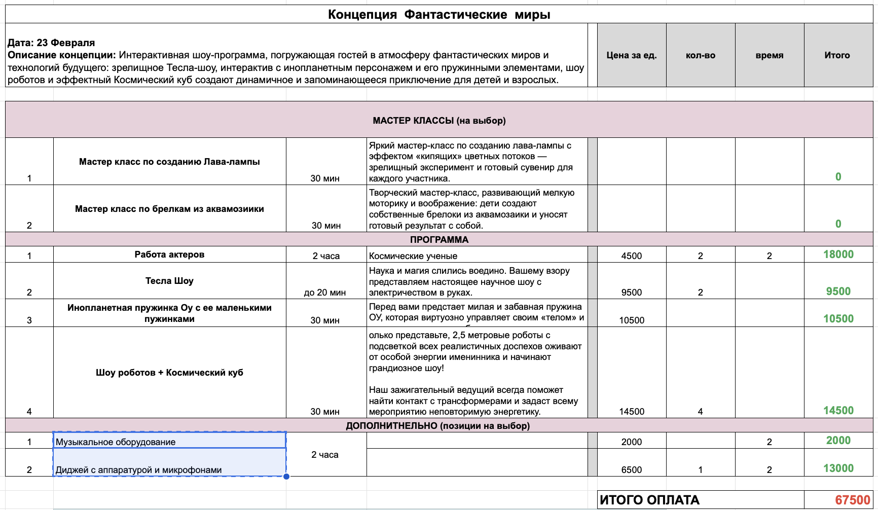 Предварительная смета праздника в Google-таблице